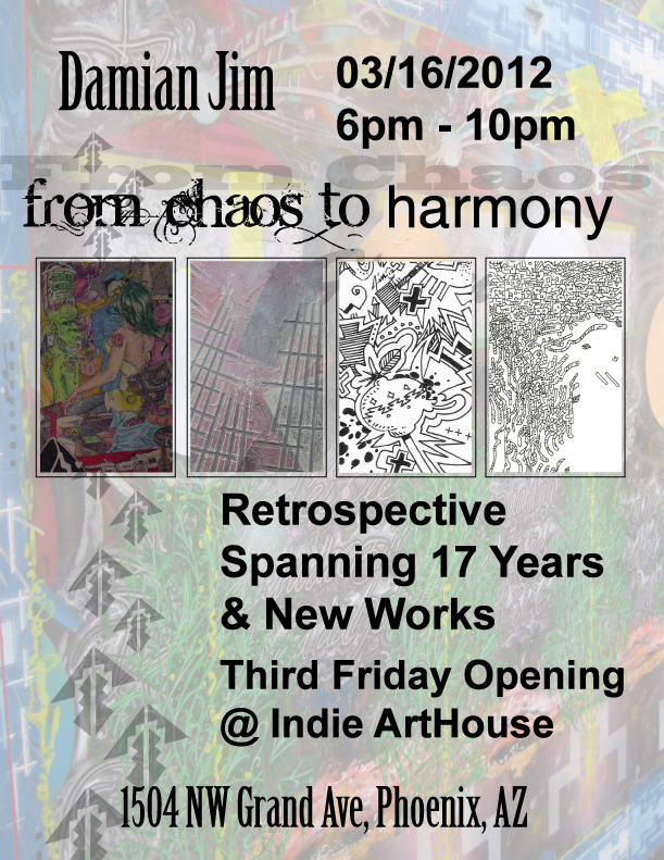 Damian Jim is a Dine’ (Navajo) artist living in Phoenix Arizona, who uses mixed media to create bold colorful pieces from his imagination. His paintings often incorporate Dine’ symbology, writing in English and Dine’, and textile patterns.